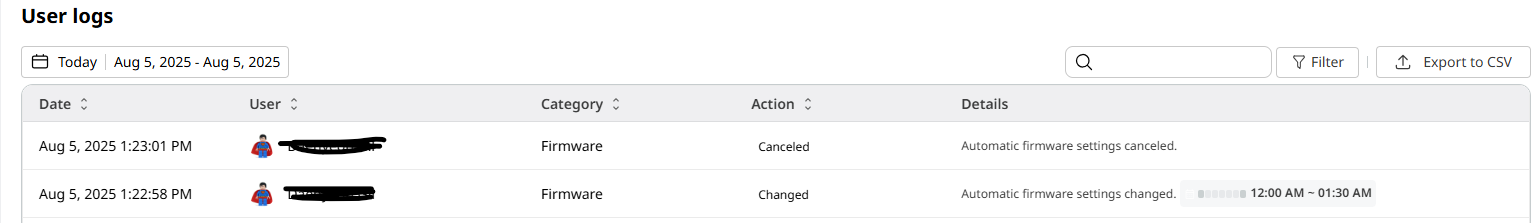 User logs - View user logs to monitor system activity, such as adding and removing users, changing roles, and enabling or disabling auto software update.