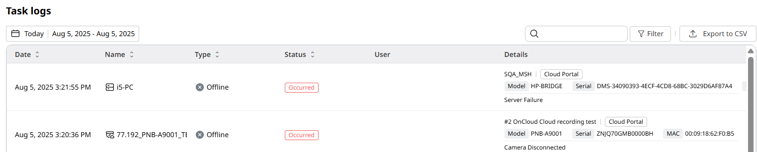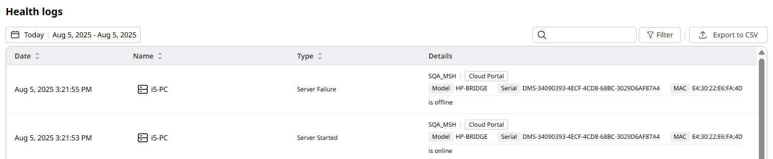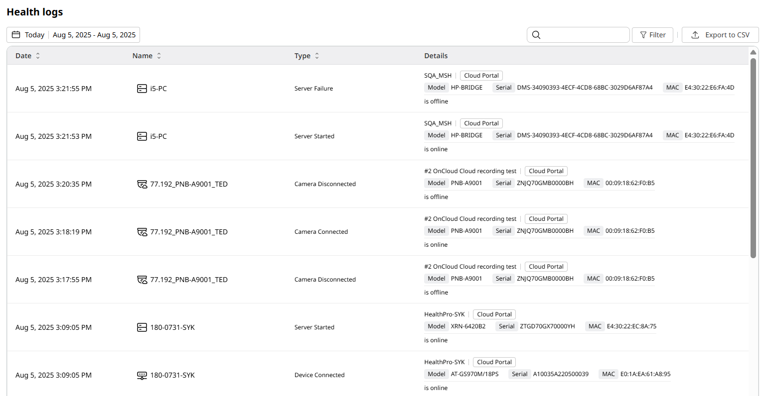 - Health logs - View health-related events, including all instances a given device goes offline.