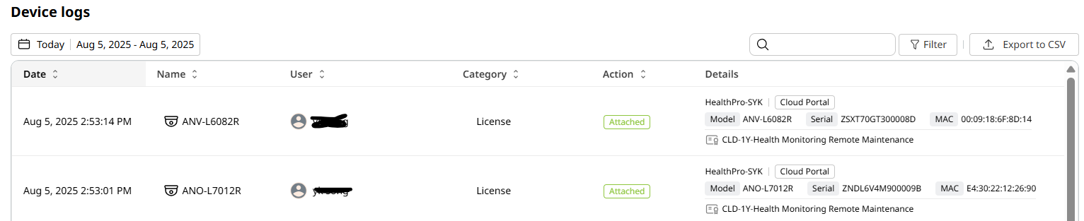 Device logs - View activities on your organization’s devices including updating (software), rebooting, licensing, claiming, and unclaiming.