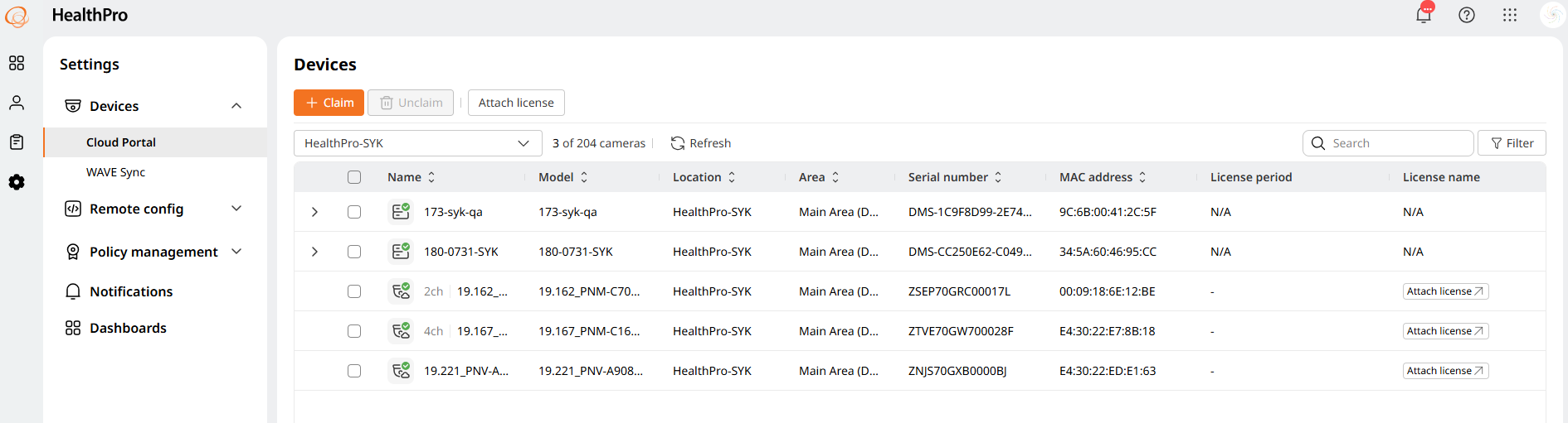 The HealthPro Bridge, the WAVE server and its cameras should now be fully onboarded and visible within Cloud Portal.