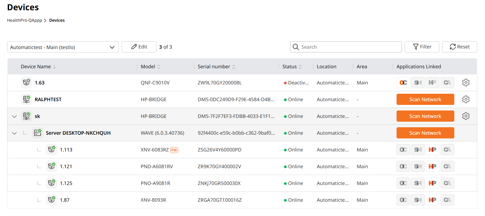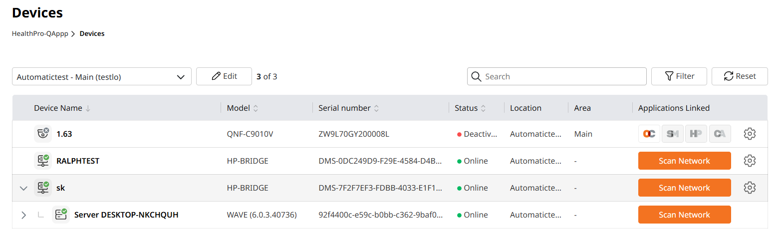 - In Cloud Portal Devices, find and expand your HealthPro Bridge, select the WAVE server, and click Scan Network.