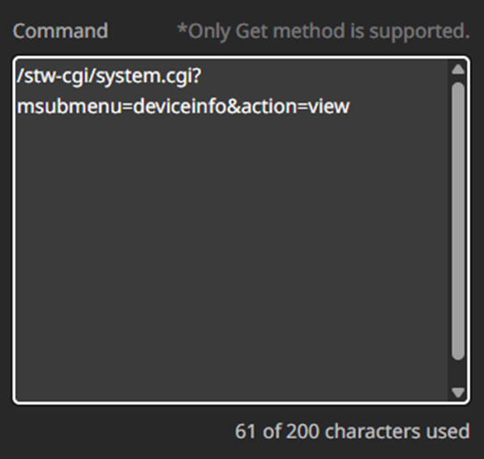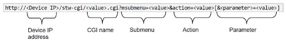 Each URL specifies the target device’s IP address and the CGI that provides the command. The URL is followed by a query string that specifies the command’s submenu, action, and parameters. For example, to view the system’s general device information in HealthPro you would use /stw-cgi/system.cgi?msubmenu=deviceinfo&action=view, which would return a string containing all the device info, e.g.