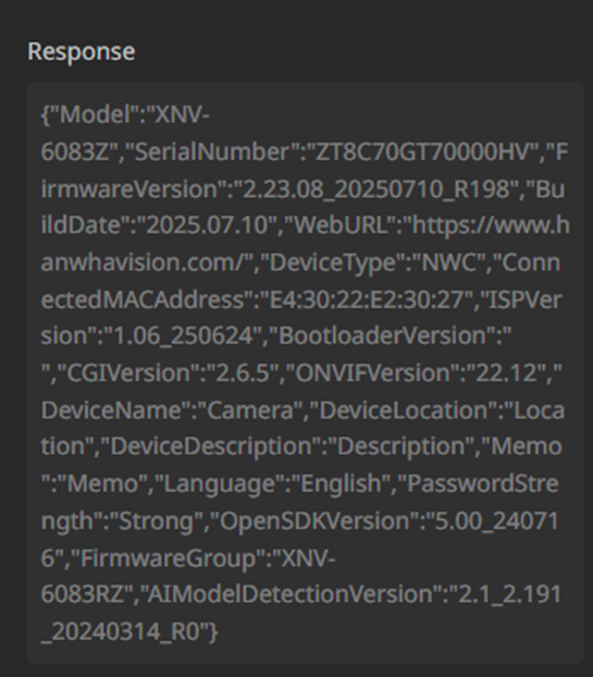 {"Model":"XNV-9083R","SerialNumber":"ZRG070GR50000KE","FirmwareVersion":"2.23.08_20250718_R29"…