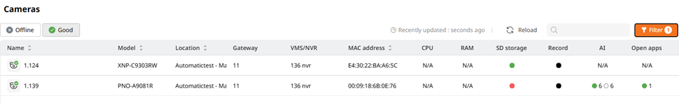 NVRs report their online/offline status, storage capacity, and utilization. - In the HealthPro dashboard, select Cameras to view their online/offline status, SD storage status, whether AI rules are configured, and the number of open apps that are installed.