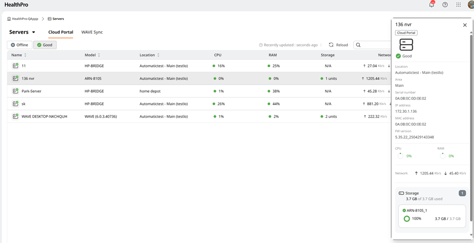 - In the main HealthPro dashboard, select Servers to view the NVR online/offline status, storage, and network bandwidth details.