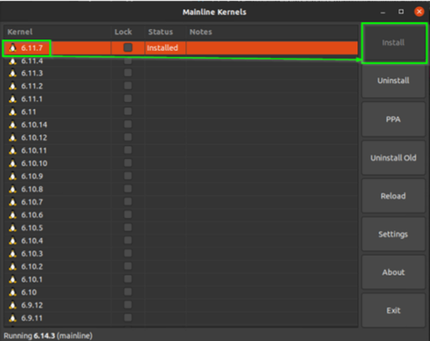 a while to fetch the latest kernel PPA information. - Select version 6.11.7 from the list, then click Install.
