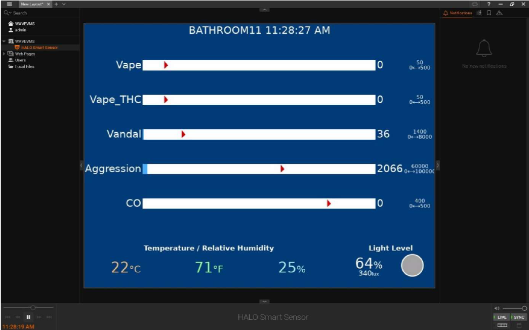 - From the navigation tree on the left, drag the device into the Viewing panel to see the live, real-time output from the HALO Smart Sensor.