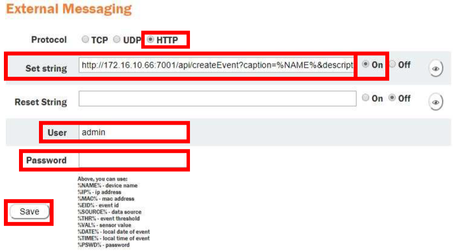 - In the Set string field, enter http://172.16.10.66:7001/api/createEvent?caption=%NAME%&description=%EID%
