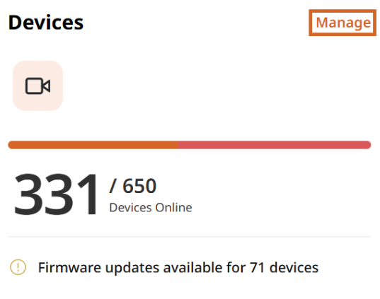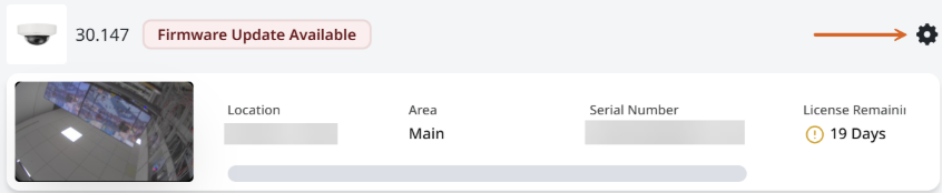 see OnCloud: How do I update firmware? - In the list of camera hardware, find the device that you want to manage, then click the Gear icon.
