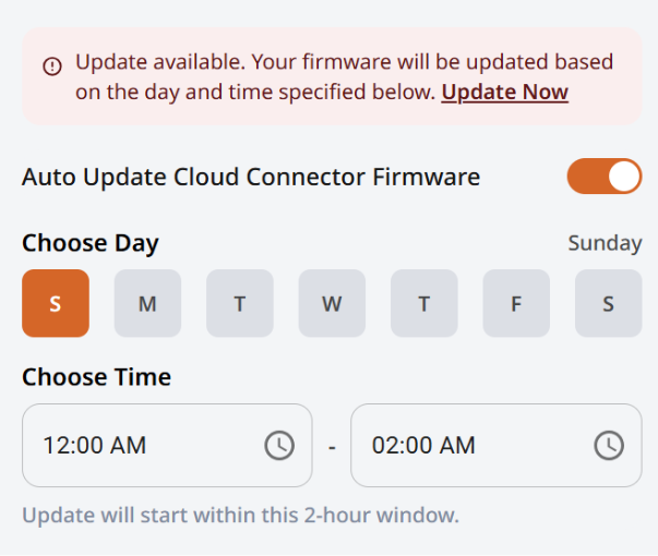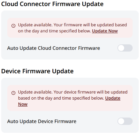 To manage firmware updates, click the Auto Update Cloud Connector Firmware toggle or the Auto Update Device Firmware toggle.