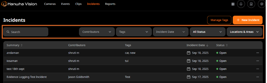 - Use the Search box to find the appropriate incident, scroll the list to locate the incident, or filter by Contributors, Tags, or Incident Date. You can also filter by Status and by Locations and Areas.