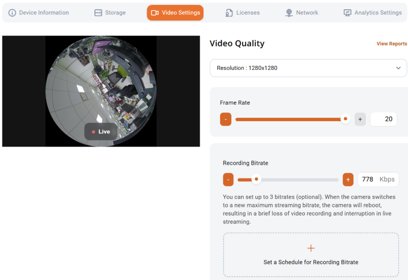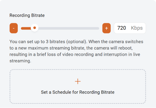 You can also set a recording bitrate schedule. For example, you may want to increase bitrates during times when you want improved recording quality, such as on weekends or late at night if a facility or area is unoccupied. You can schedule up to three recording bitrates.