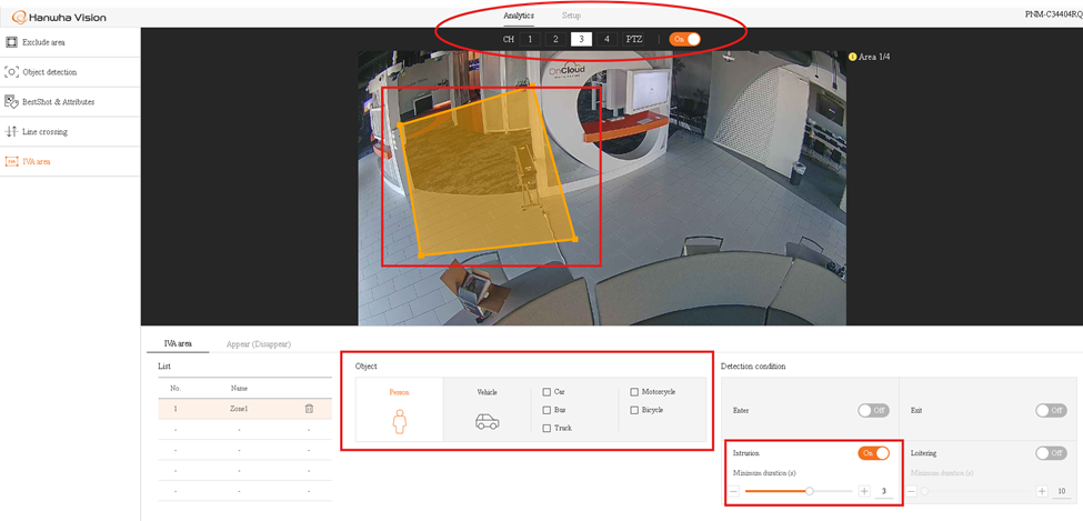 Intelligent video analytics (IVA) uses artificial intelligence (AI) and machine learning to automate the analysis of video footage, transforming it into actionable insights rather than just raw data. By applying AI to live or recorded video streams, IVA systems can automatically detect people, objects, and activities. This enables real-time alerts for security events, enhances situational awareness, improves operational efficiency, and supports data-driven decision-making across various sectors like security, retail, and smart cities. This article describes how to set up an IVA on Hanwha Vision Cameras equipped with WiseAI. In this article, the PNM-C34404RQPZ fixed sensors are used as an example. The same process applies for any Hanwha Vision Camera equipped with WiseAI.