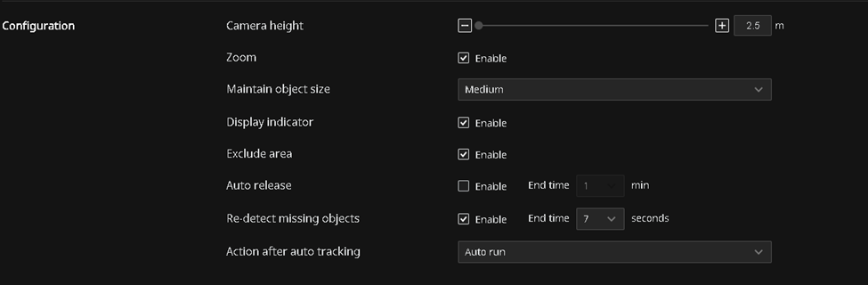 Zoom: Allows camera to manage configured zoom level on tracked object.