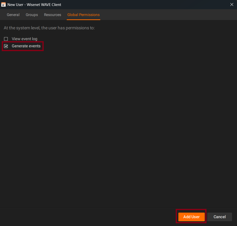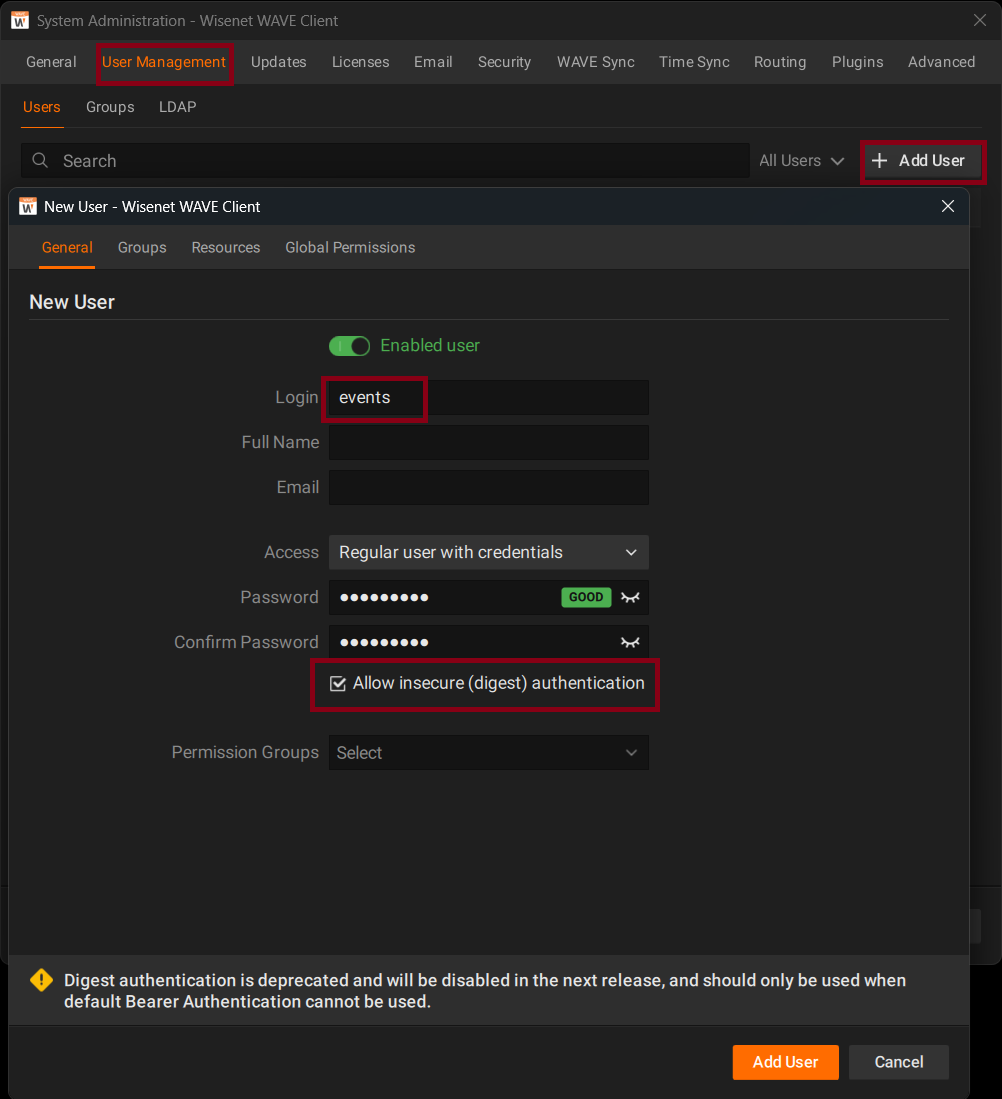 Create a new user to allow digest authentication and creating events. To prepare a WAVE server: