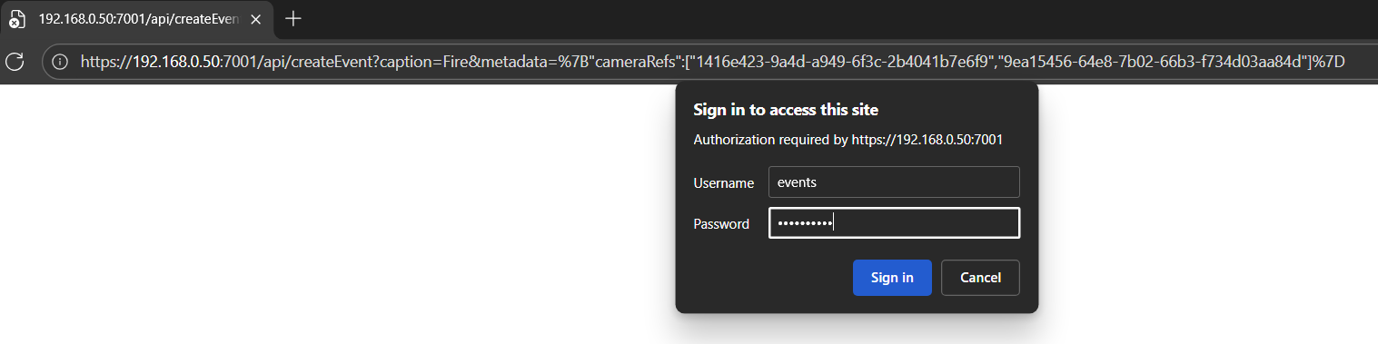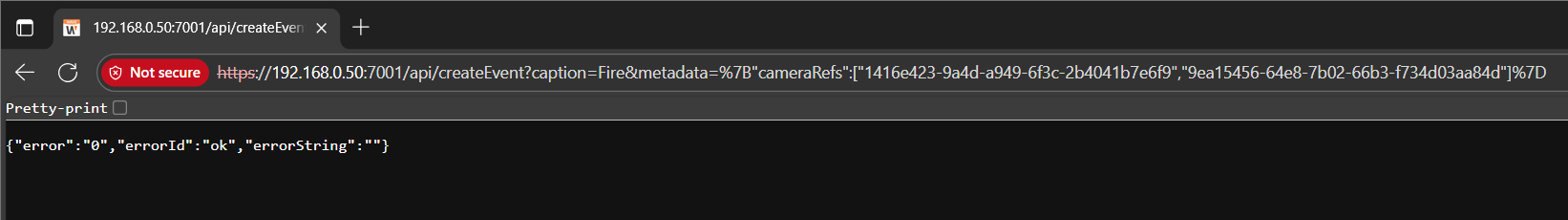 http://192.168.0.50:7001/api/createEvent?caption=Fire&metadata={"cameraRefs":["1416e423-9a4d-a949-6f3c-2b4041b7e6f9","9ea15456-64e8-7b02-66b3-f734d03aa84d"]}