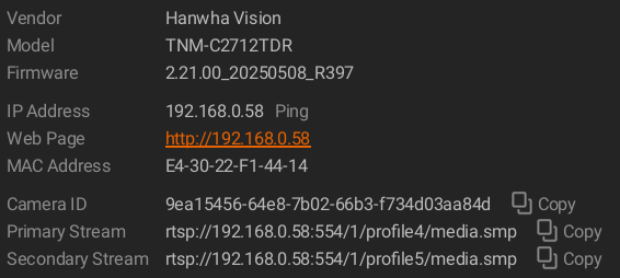 "cameraID" can be found under camera settings page, and metadata can include more than just one reference. In this example, we will use Hanwha's early fire detection bi-spectrum camera, TNM-C2712TDR, and show you how it can bind two source cameras into a single event.