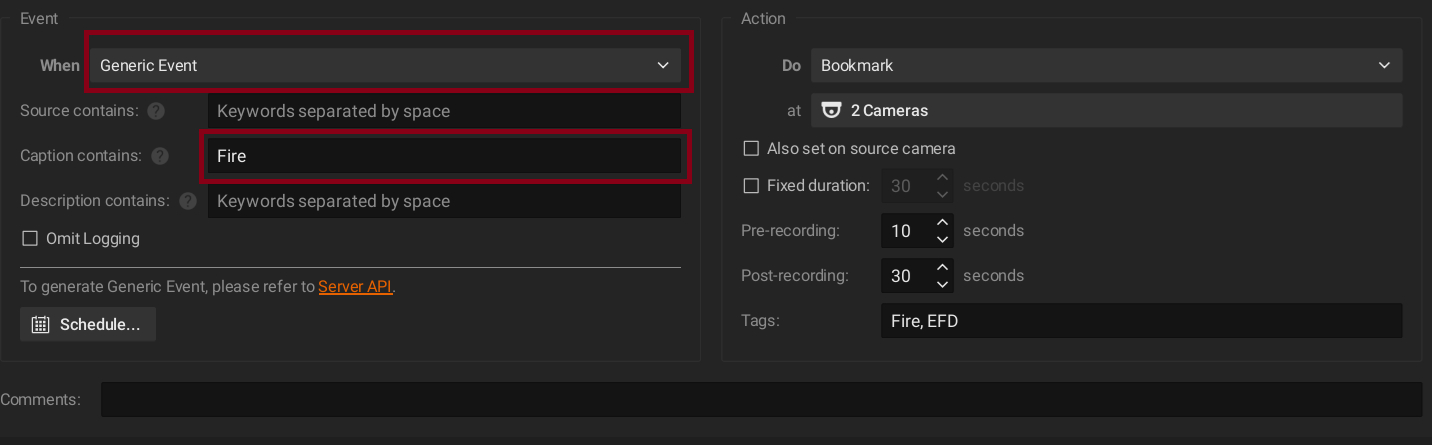 In this example, bookmarking on two cameras with two different tags for quick search afterwards is being used. Using the same trigger, one can create another event rule, but different Actions, as many as they need.