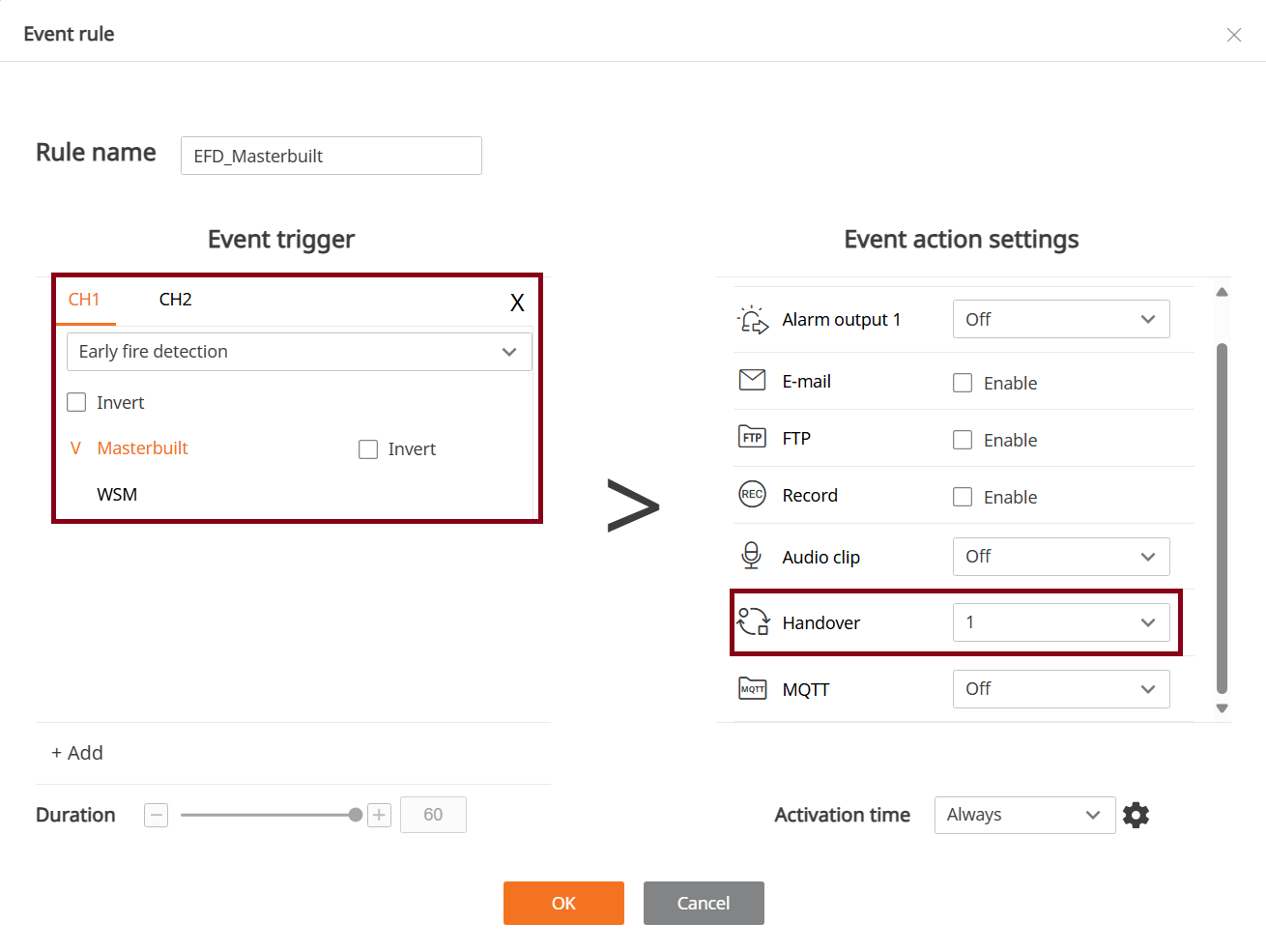 - Select the appropriate Event trigger and set Event action settings as Handover 1 as created above. This example will monitor my Masterbuilt grill for Early Fire Detection trigger, to take Handover 1 action.