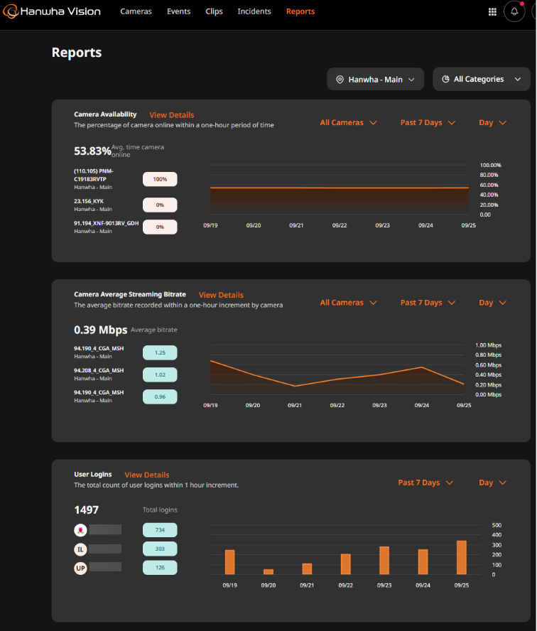 Reports provide information about camera availability, the average bitrate for each camera, and user logins to the system.