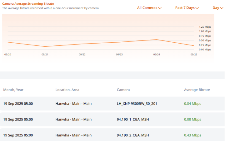 Camera Average Streaming Bitrate – The average bitrate recorded within a one-hour increment, by camera.