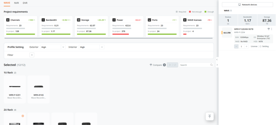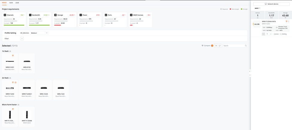 A warning appears if there are discrepancies between what is needed and what is included in the project, including channel licenses, network bandwidth, storage, power, and network ports.