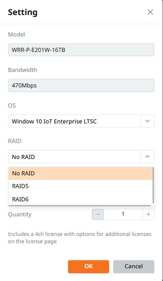 A window appears that displays the model, bandwidth capabilities, Operating System options, RAID options, and total HDD storage capacity options.