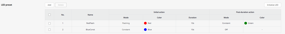 - Under Post-duration action, select the Mode and Color. In the example, a Blue Constant Preset is configured for ten seconds, followed by the LED turning off.