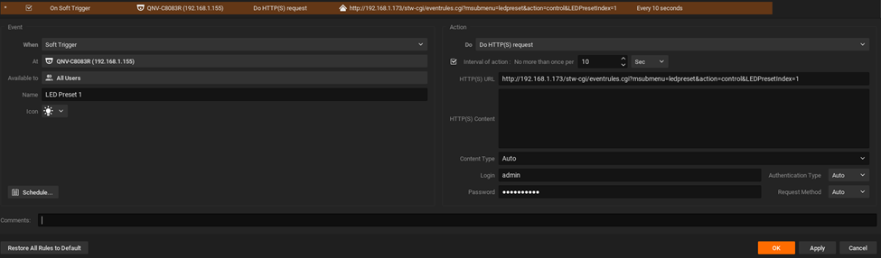 http://<IP-ADDRESS>/stw-cgi/eventrules.cgi?msubmenu=ledpreset&action=control&LEDPresetIndex=1