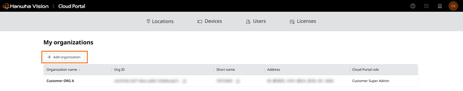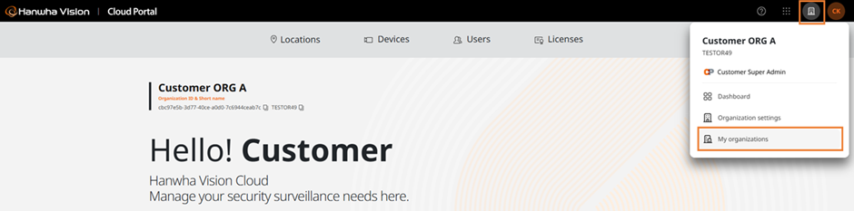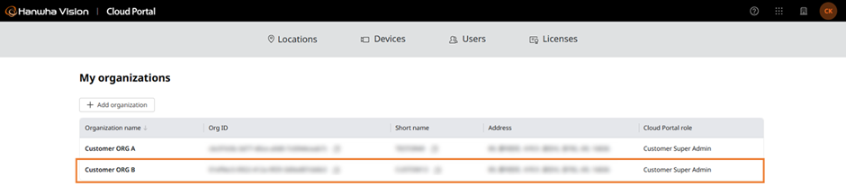 A single Hanwha Account can belong to a maximum of 50 Customer Organizations. This limit includes both customer ORGs you add yourself and customer ORGs to which you are invited.