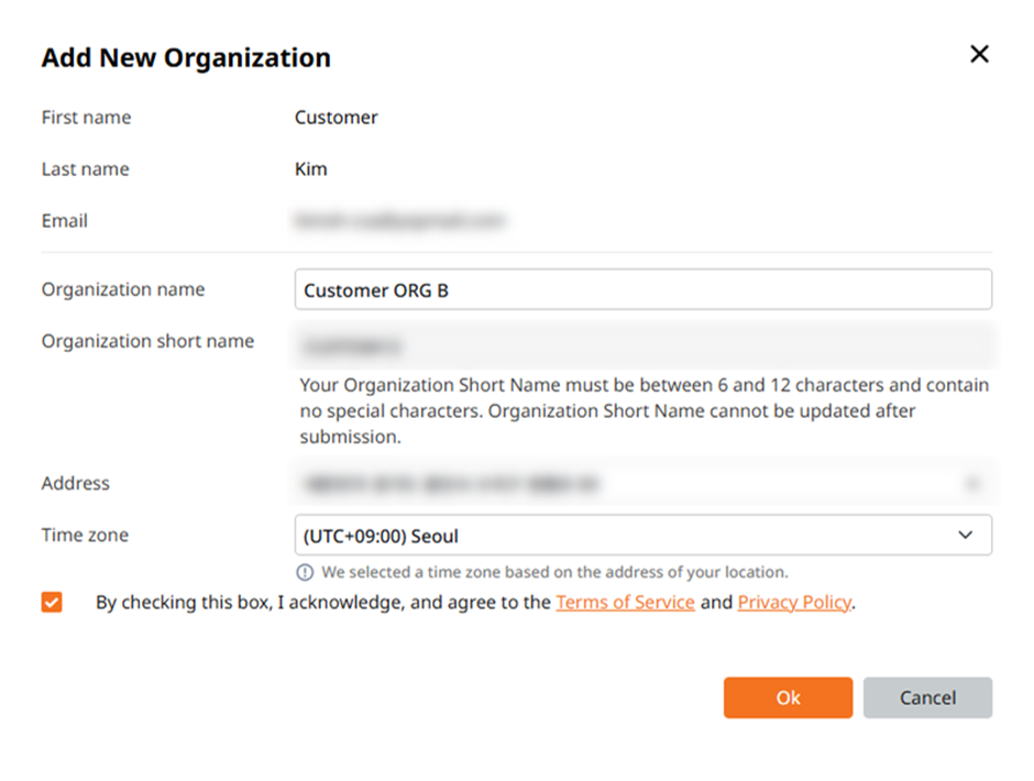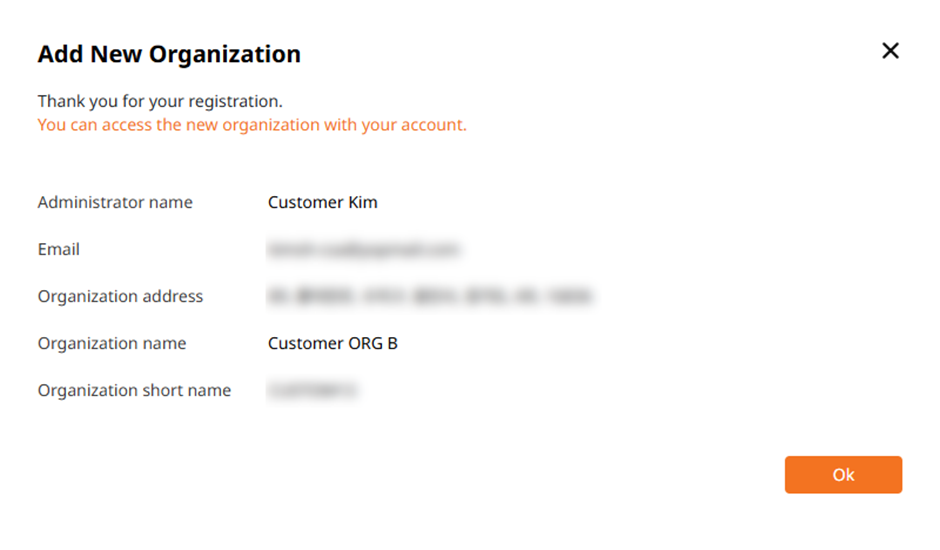 - Verify the entered information and click OK. You are automatically be assigned the Customer Super Administrator (CSA) role for this new organization.