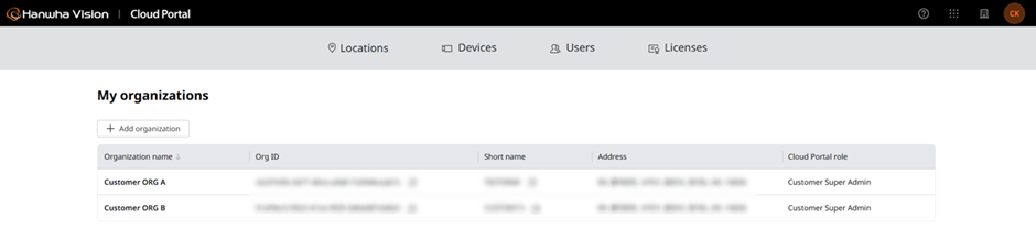 Item Description Functionality ORG Name The full name of the organization. Clicking the name switches your Working ORG to the selected organization. ORG ID / Shortname The unique identifier for the organization. Click the copy icon to copy the ID/Shortname to your clipboard. A Copied tooltip appears upon completion. Address The full address of the organization (Address Line 1, City, State, Country, Zipcode). Cloud Portal Role Your specific role within that organization (e.g., Super Admin, Admin, User).