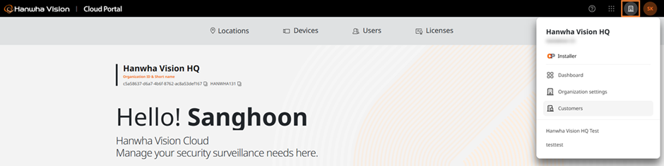 Switching: Clicking a Customer ORG from the list switches the Working ORG to that Customer ORG.