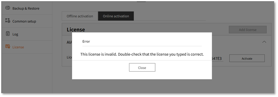 A New Camera + New AI Pack (AIA-C01FAC, AIA-C01TRF) License Activation Error occurs. The following message displays: This License is invalid. Double-check that the license you typed is correct.
